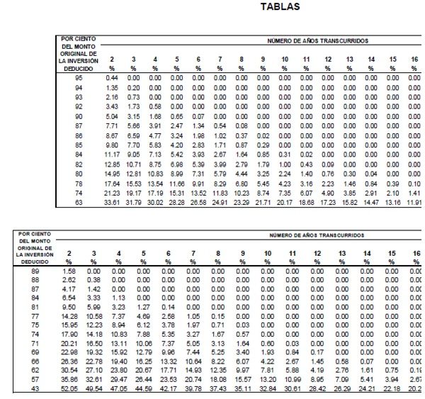 Cuando los bienes se enajenen, se pierdan o dejen de ser útiles, se podrá efectuar una deducción al MOI actualizado los por cientos conforme al número de años transcurridos desde que se efectuó la deducción. Las tablas de estos porcentajes son estas, aunque igual las puedes visitar en el presente decreto.