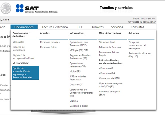 Como todo trámite en el SAT (Servicio de Administración Tributaria), nos ubicamos en la pagina principal –> Trámites –> Declaraciones –> Mi contabilidad –> Opción de acumulación de ingresos por personas morales