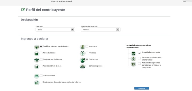 Enseguida se podrá elegir qué declaración se presentará, el ejercicio, tipo de declaración y, de forma automática, de acuerdo al sistema, también aparecerán el tipo de ingresos que se perciben, que en este ejemplo se trata de una persona física son ingresos por Sueldos, salarios y asimilados y Actividad empresarial: