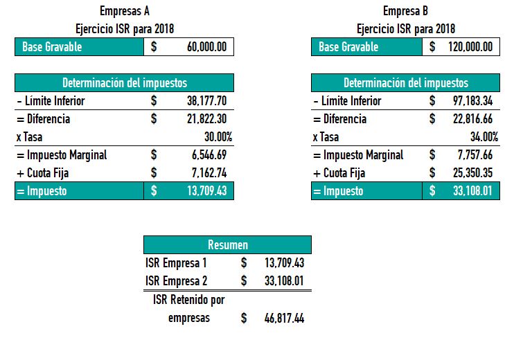 Primero consideremos ingresos de la empresa 1 por 12 meses, es decir 60 mil pesos (5 mil por 12) y por la otra empresa, 120 mil pesos (10 mil por 12). Lo primero que haremos será calcular el ISR de ambos.