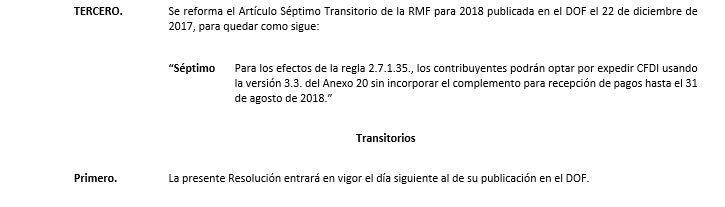 “Para los efectos de la regla 2.7.1.35., los contribuyentes podrán optar por expedir CFDI usando la versión 3.3. del Anexo 20 sin incorporar el complemento para recepción de pagos hasta el 31 de agosto de 2018.”
