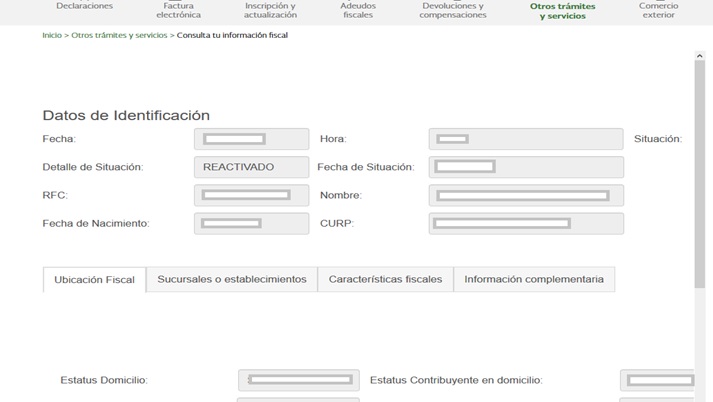 Primero, los datos de identificación del contribuyente, desde su RFC, su CURP, su ubicación fiscal, la hora y fecha de la consulta, y si se encuentra Activo
