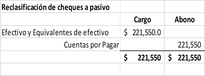 El monto de los cheques emitidos con anterioridad a la fecha de los estados financieros que estén pendientes de entrega a los beneficiarios debe reincorporarse al rubro de efectivo reconociendo el pasivo correspondiente.