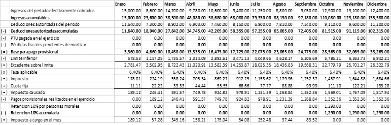 A los ingresos que efectivamente se hayan percibido ya sea en efectivo, en bienes o en servicios, aun tratándose de anticipos o depósitos, se les restará las deducciones autorizadas, el pago por concepto de PTU que haya sido pagada en el ejercicio y las pérdidas fiscales que no se hubieran disminuido anteriormente; una vez obtenido este resultado, habrá que considerar que, en el mismo artículo 106 indica que se tomará como base la tarifa del articulo 96 para calcular el impuesto, y la autoridad fiscal será la encargada de realizar los cálculos pertinentes por cada una de las tablas con las tarifas aplicables para cada uno de los meses del ejercicio, los cuales se utilizaran para el cálculo del pago provisional mensual, previa publicación oficial, una vez que se haya obtenido el impuesto del periodo del que se trate, también se podrán acreditar los pagos de impuesto que anteriormente se hayan realizado (en el ejercicio) así como también se podrá acreditar la retención del 10% que las personas morales, si fuera el caso, hubieran retenido por la prestación de servicios.