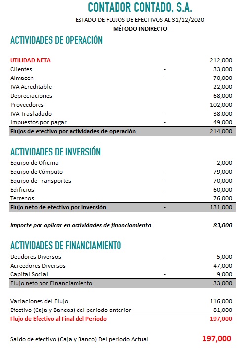 Este método indirecto tiene la principal característica que el estado de flujos se inicia partiendo de la utilidad, para posteriormente elaborarse con los rubros del balance general.