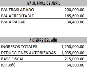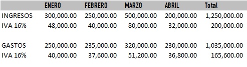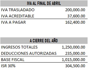 Observa como en este ejemplo muy sencillo, el contribuyente debería pagar al final del cuarto mes, un IVA de $162,400. Si las cifras se quedaran así en lo que resta del año, tendría un ISR a cargo de $304,500, lo que supone una carga fiscal de $466,900.