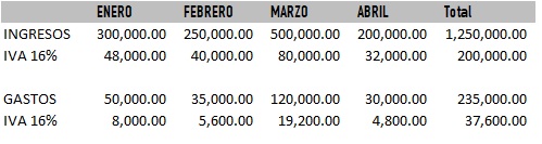 Observa como en este ejemplo muy sencillo, el contribuyente debería pagar al final del cuarto mes, un IVA de $162,400. Si las cifras se quedaran así en lo que resta del año, tendría un ISR a cargo de $304,500, lo que supone una carga fiscal de $466,900.