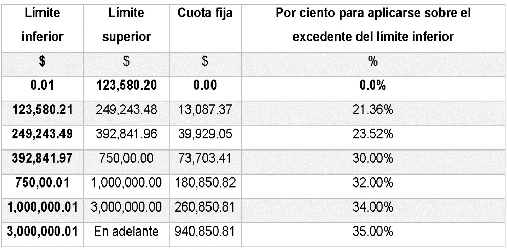 Por otro lado, el artículo 152 que nos habla de los ingresos anuales muestra que aquellas personas que ganen menos de 123,580.20 en un ejercicio fiscal tampoco pagarían impuestos como se muestra en la siguiente tabla.