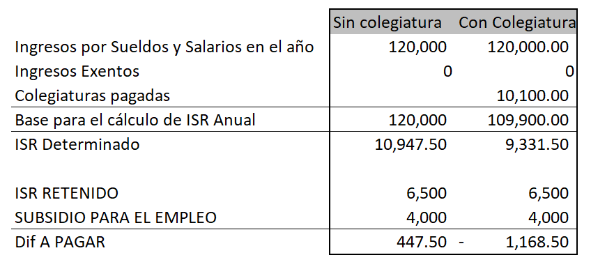 Como se puede apreciar en el ejercicio anterior, las deducciones personales sirven para disminuir la base para el cálculo. En el caso donde no hay colegiaturas o no se ocupa este estímulo, vemos que arroja un saldo a pagar, mientras que por el lado donde sí se ocupa dicho estímulo de deducción personal existe un saldo a favor, mismo que el contribuyente podrá solicitar como devolución.