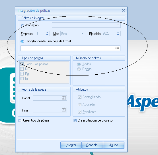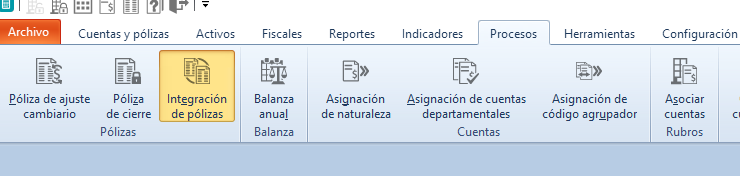Y una vez que se tiene el archivo terminado, el paso siguiente es generar las pólizas, importando dicho archivo desde el sistema Aspel COI –> la empresa de que se trate –> Procesos –> Integración de pólizas: