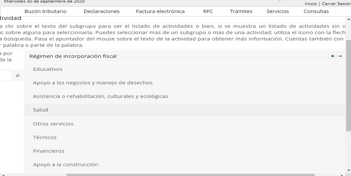 Y de igual forma, tratándose de las actividades específicas, nos permite la selección correspondiente, tanto por Régimen de Incorporación Fiscal como por plataformas digitales: